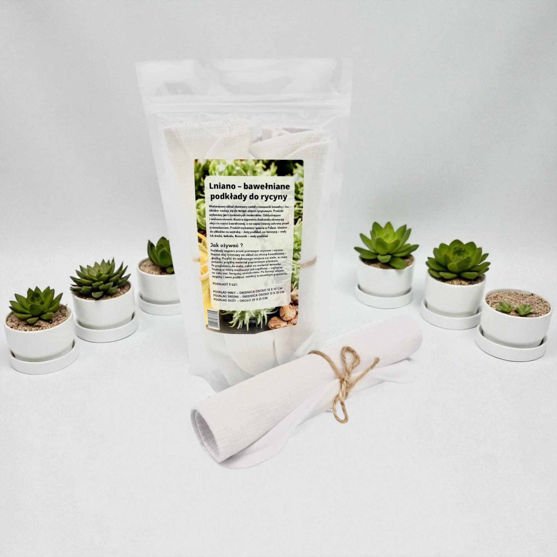 Naturalny wielorazowy okład stworzony z mieszanki bawełny i lnu – idealne nadaje się do terapii olejem rycynowym. Produkt wykonany jest z naturalnych materiałów. Oddychająca i wielowarstwowa tkanina, użycie wielorazowe. Doskonała absorpcja oleju na części bawełnianej, a na części lnianej ochrona przed przemakaniem. Produkt wykonany ręcznie w Polsce.
