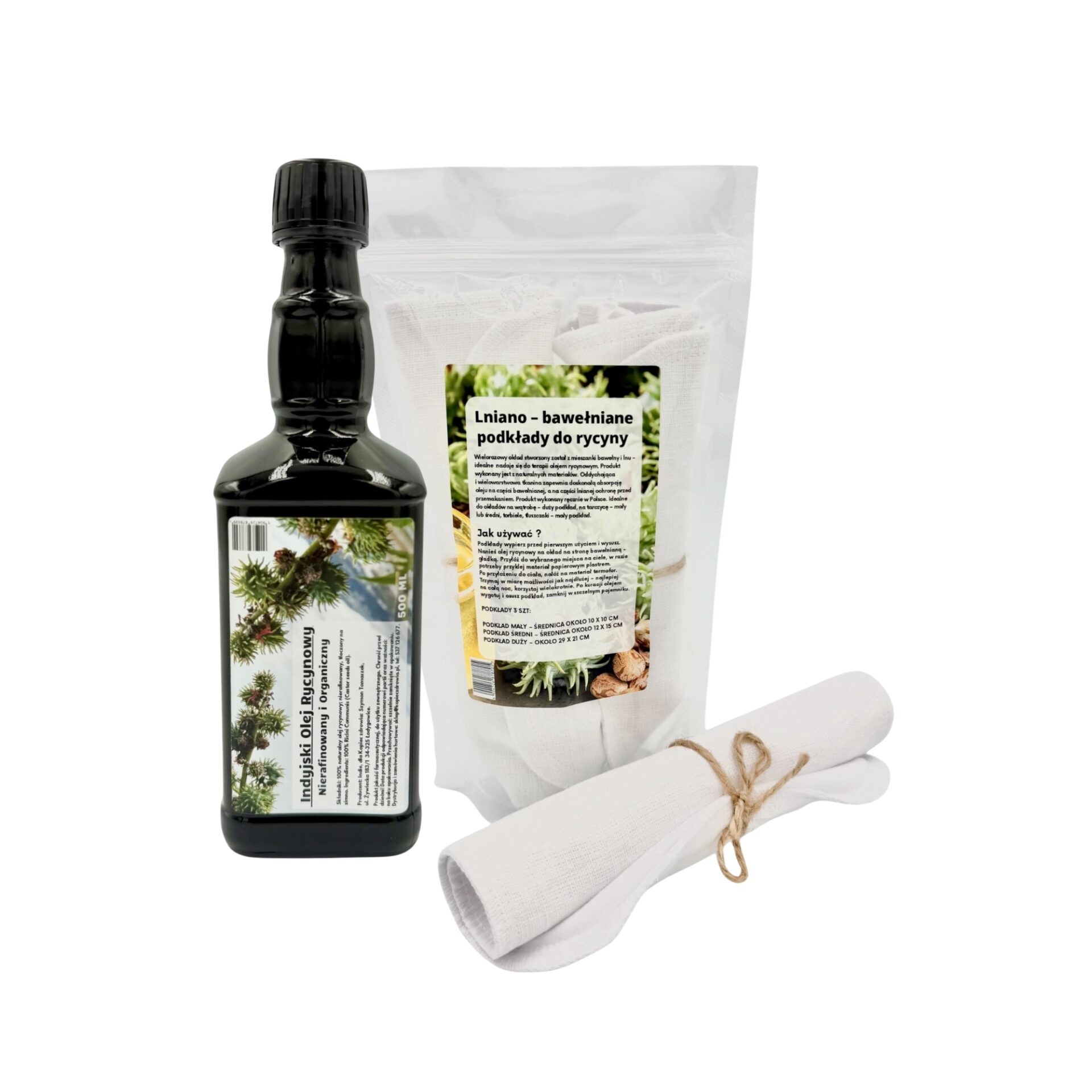Idealny komplet do terapii olejem rycynowym, wykonany z naturalnych materiałów, przeznaczony do użytku zewnętrznego.