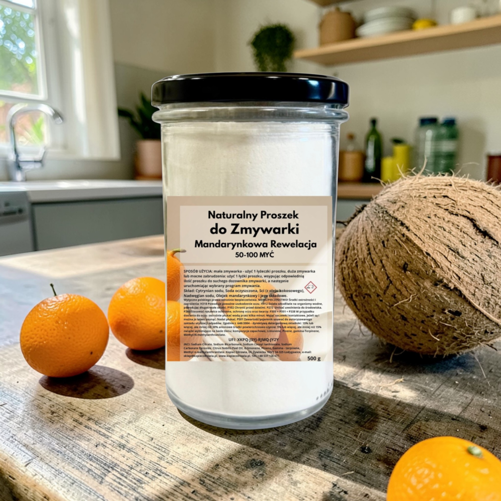 Naturalny proszek do zmywarek, który skutecznie usuwa tłuszcz, zaschnięte resztki jedzenia i osady, pozostawiając naczynia idealnie czyste, lśniące i delikatnie pachnące naturalnym olejkiem z mandarynki. Produkt powstał w wyniku wielu miesięcy pracy nad dopracowaną formułą. Kompozycja zapobiega powstawaniu zacieków po kawie, herbacie i tłuszczu oraz chroni szkło i stal nierdzewną. Naczynia są czyste i myte w ekologiczny sposób.